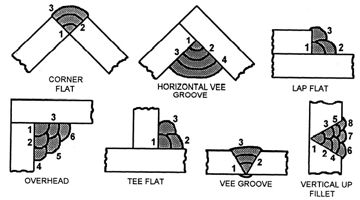 Here are several ways to do MIG multipass welding. The numbers in each drawing shows you what sequence you would lay the bead down:
