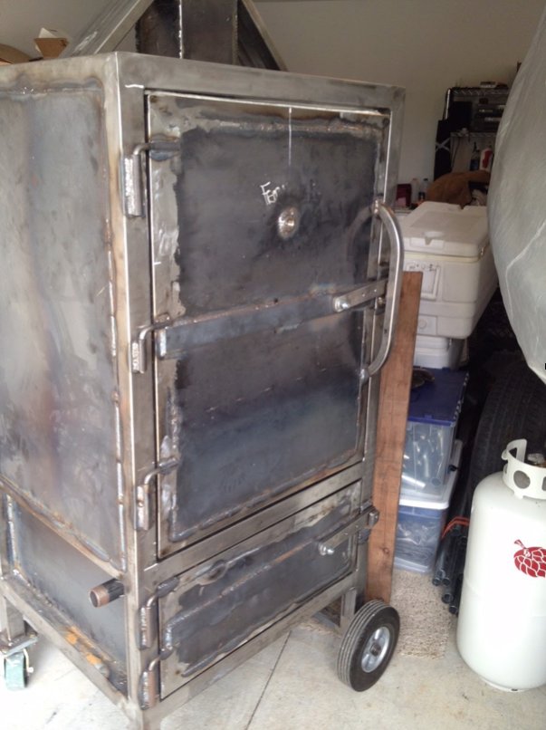 This thing is big with finally 3 the finished result all painted up with locks on the door because it was purchased by a High School Culinary Program and he wanted to keep the cooking grates (all stainless) and the propane burner safe from the high school hooligans, hence the locks.